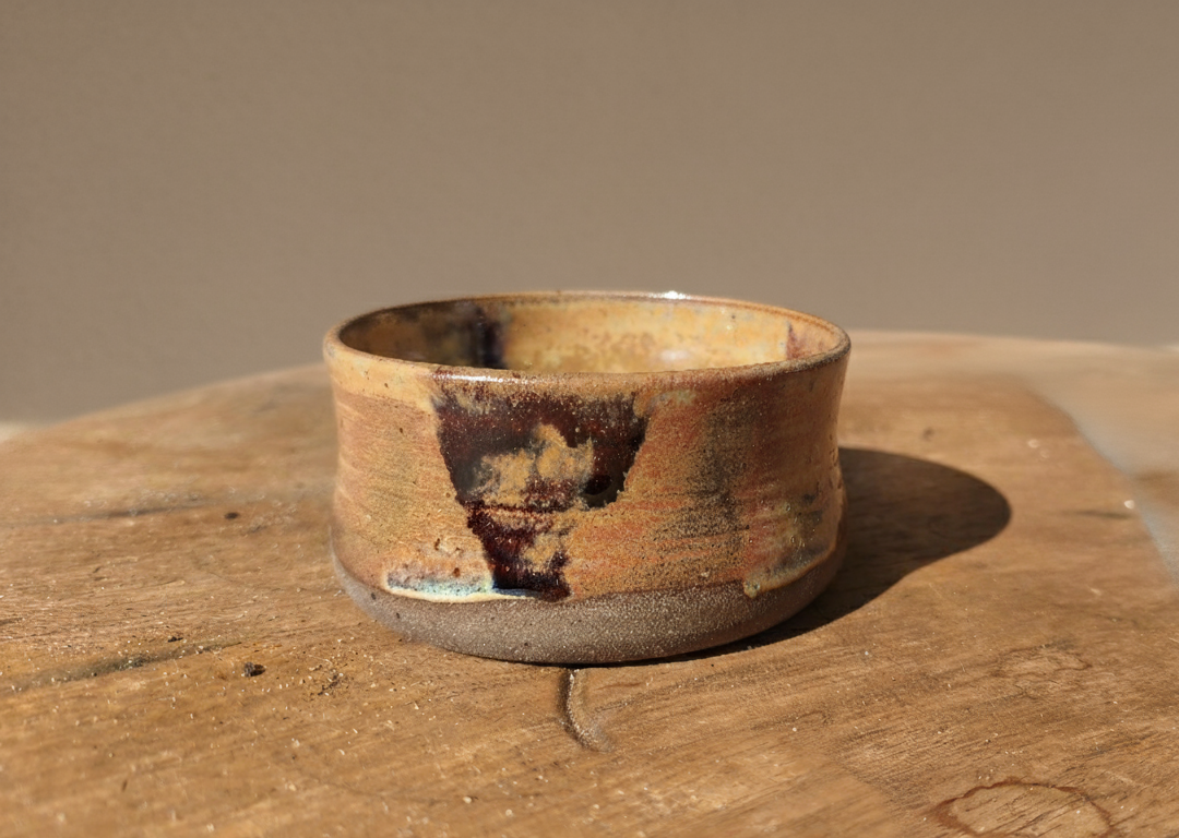 Tazza da tè matcha realizzata in gres marrone e smalto cangiante beige/arancione.